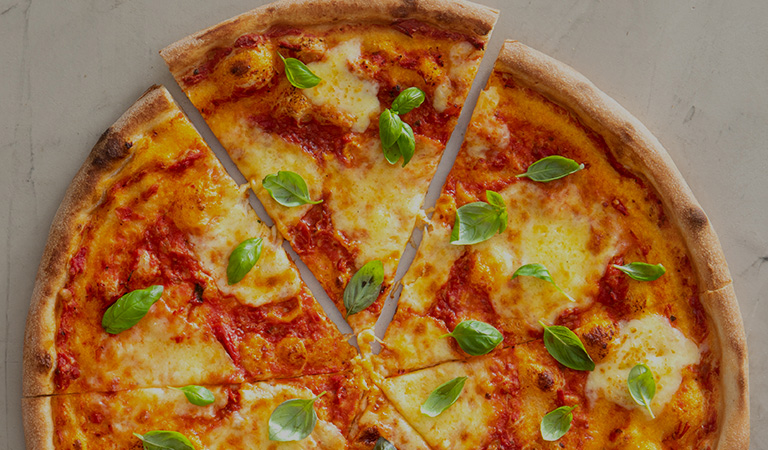 Bollo de pizza, salsa de tomate, muzzarella, albahaca